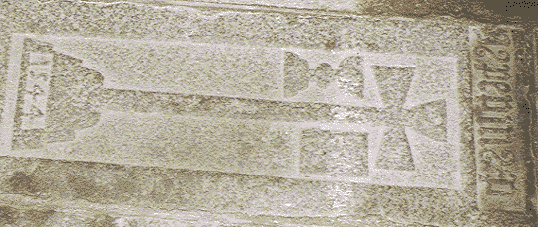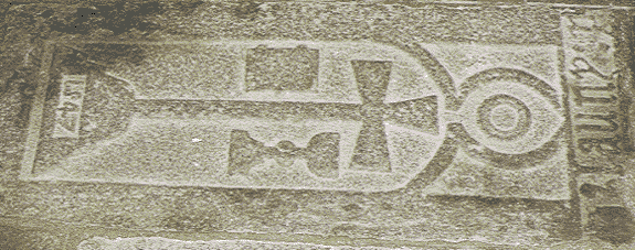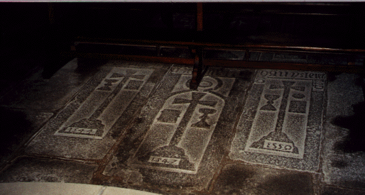 Parmi les pierres tombales qui tapissent le sol près du choeur de l'église, certaines sont datées et mentionnent des noms, illisibles!, ou encore sont ornées de motifs tel un corbeau attribut d'un certain Corbin.